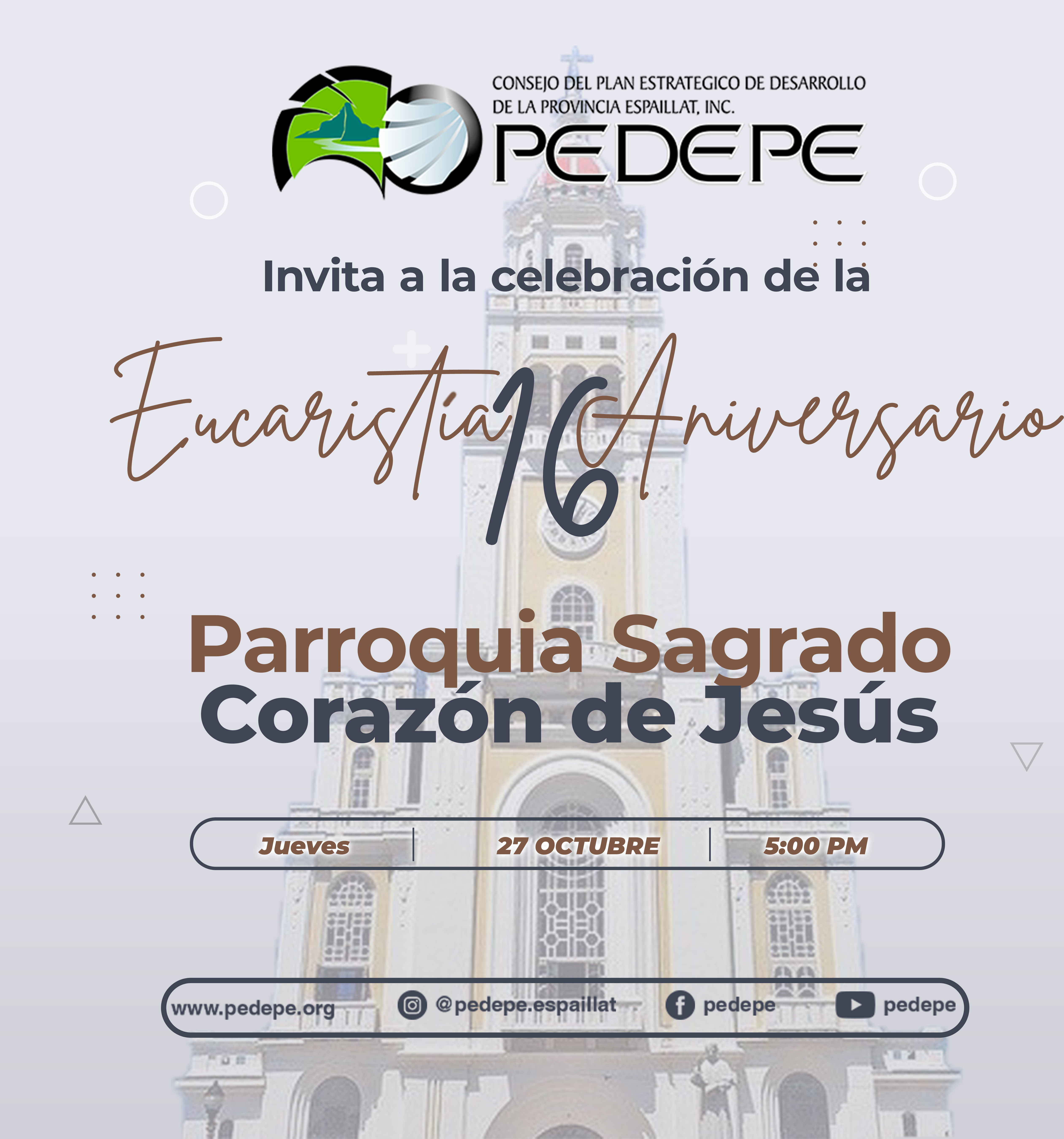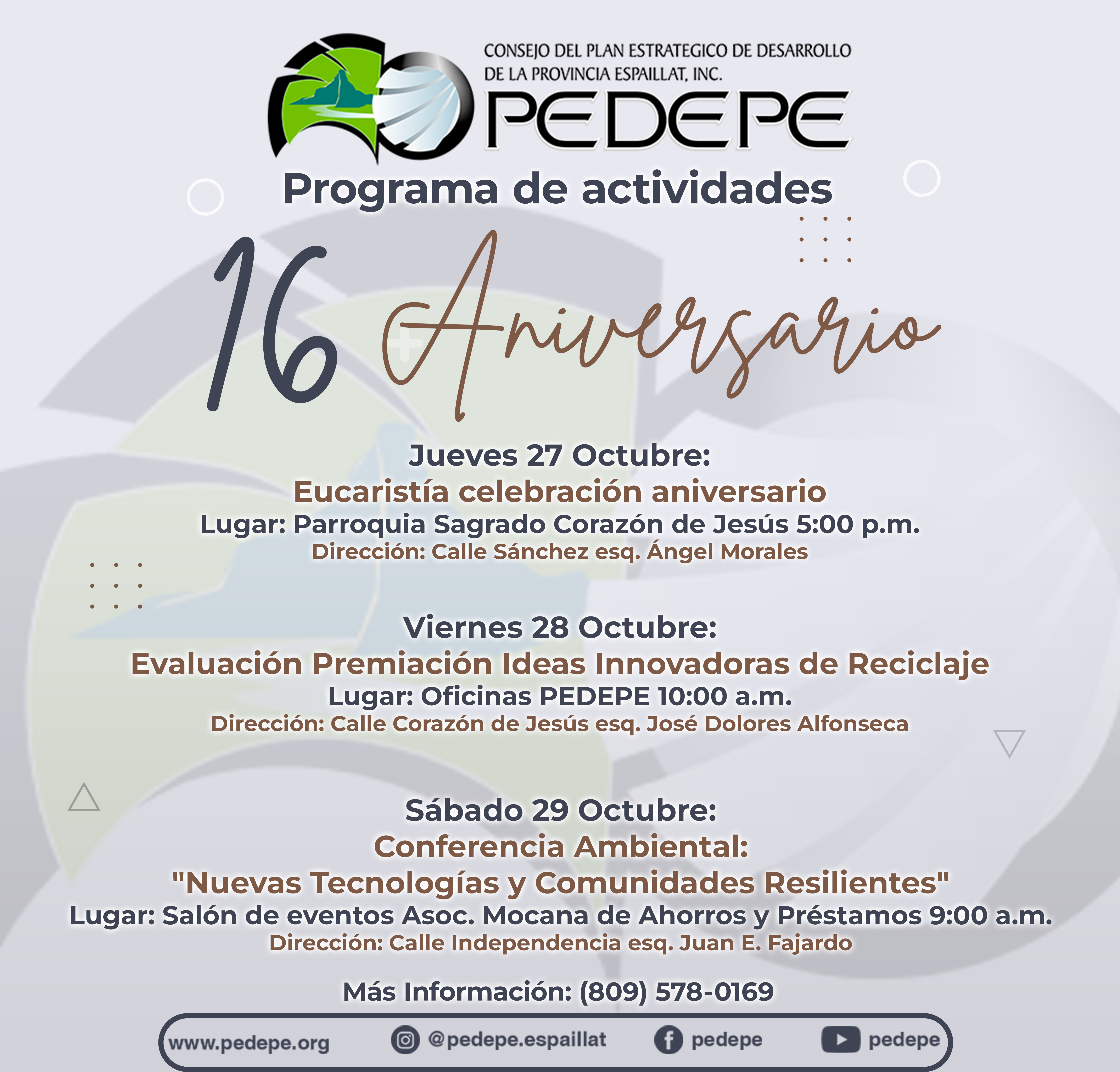En celebración del 16 aniversario de su creación, el Plan Estratégico de Desarrollo de la Provincia Espaillat (PEDEPE) invita a toda la población a participar en las diferentes actividades organizadas con mucho entusiasmo para festejar los años de servicio en pro del desarrollo integral de la provincia Espaillat.